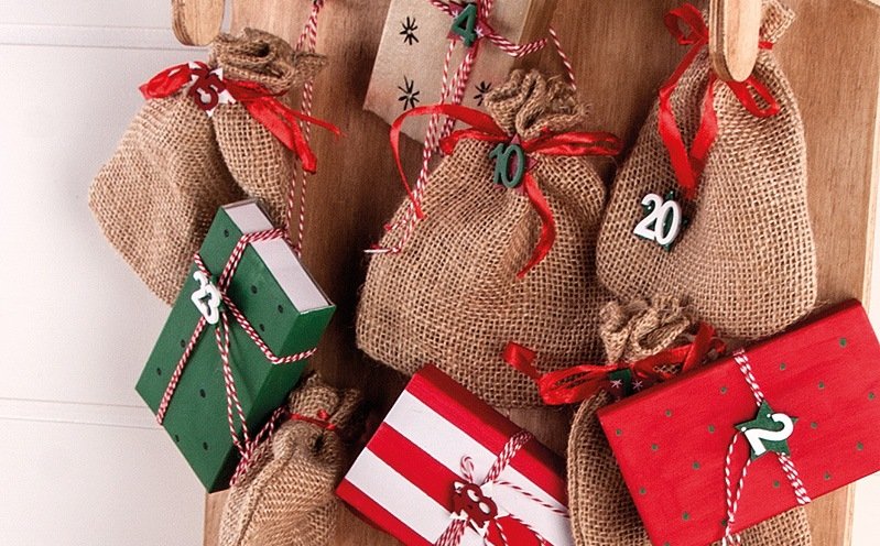 Klebe die Adventskalenderzahlen auf die 24 Päckchen. Die Adventskalenderzahlen auf den Jutesäckchen klebst du mit etwas Heißkleber nach.