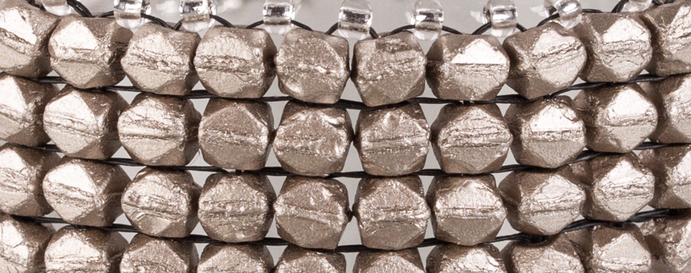 Wiederhole die 1. und 2. Reihe bis deine Armbandlänge erreicht ist. (38 Reihen in unserem Modell).Tipp: Das Aufreihgarn zurück durch die gefädelten Perlen vernähen und ein neues Aufreihgarn einnähen.