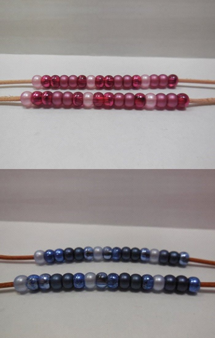 Jeweils 16 Großloch Rocailles gegengleich auf die beiden 25 cm langen Lederriemen fädeln und die Enden mit einem Knoten sichern.3 ![]()