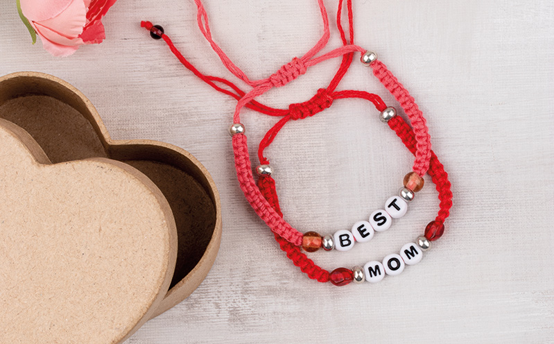 Für 1 Armband benötigst du 4 Stränge vom Baumwoll-Garn “Stitch & Knot”: 2 × 50 cm und 2 × 1 m. Armband „BEST“ wird mit dem zweithellsten Farbton des Baumwoll-Garns gefertigt und das Armband „MOM“ mit dem mittleren Farbton des Baumwoll-Garns.