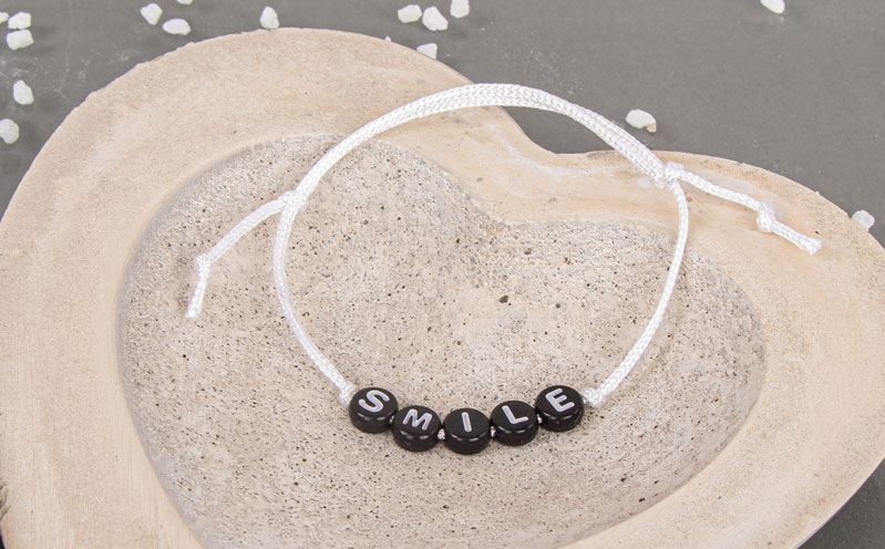 Für das Armband benötigst du 50 cm Schmuckkordel. Fädle die Buchstaben „SMILE“ auf die Schmuckkordel auf und schiebe diese in die Mitte.