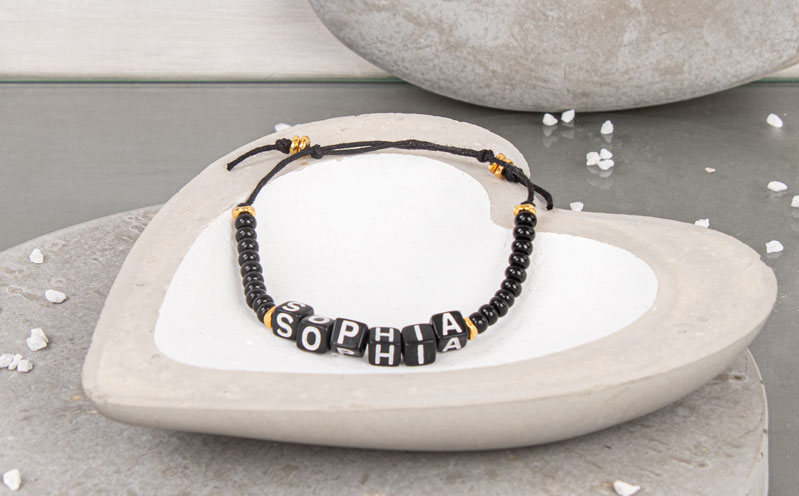 Für das Armband benötigst du 50 cm gewachste Baumwollkordel. Fädle zuerst 1 Metall-Perle gold, 10 Indianer-Perlen schwarz, 1Metall-Perle gold, dann die Buchstaben „SOPHIA“, 1 Metall-Perle gold, 10 Indianer-Perlen schwarz und 1 Metall-Perle gold auf und richte alle Perlen mittig aus.2 ![]()