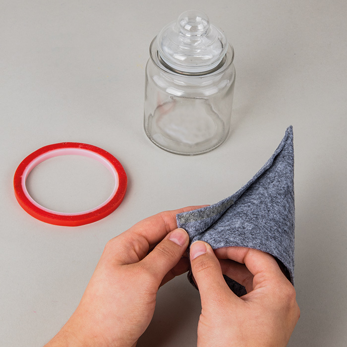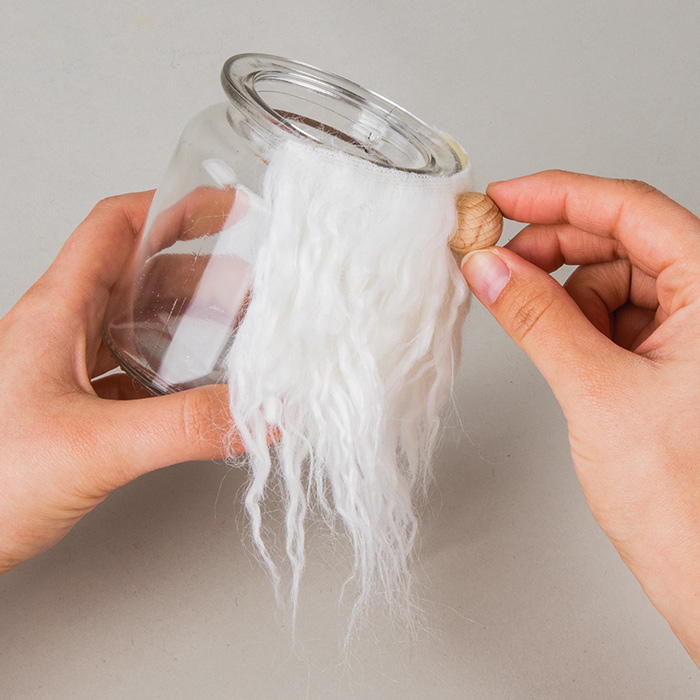 Mit dem Doppelklebeband klebst du anschließend den Langhaarplüsch an den oberen Rand des Glas-Gefäßes. Die Rohholzkugel wird dann mittig auf den oberen Rand des Langhaarplüschs als Nase aufgeklebt.3 ![]()