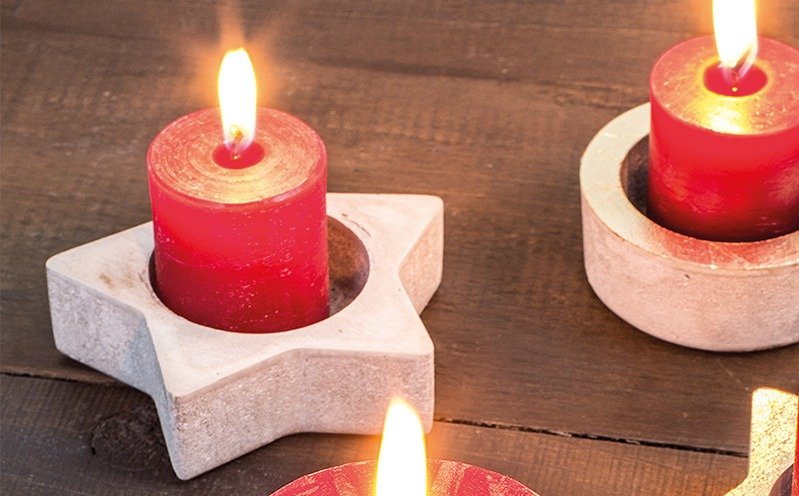 Fülle die Gießmasse bis zur gewünschten Höhe in die vorbereitete große Stern-Gießform (am besten nicht ganz bis zum oberen Rand gießen). Die Masse ca. 1 – 2 Minuten ruhen lassen.Tipp: Damit die Luftblasen in der Beton-Gießmasse reduziert werden, setzt du die Kreis-Gießform erst mit einer Seite auf der Gießmasse auf und legst den Rest der Form anschließend mit leichtem Druck nach und nach langsam auf. Ist die ganze Gießform aufgelegt kannst du diese mit leichtem Druck bis zur gewünschten Tiefe eindrücken und durch Hin- und Herschieben vorsichtig noch ausrichten. Anschließend beschwerst du die Gießform bis zur gewünschten Tiefe mit Kies oder kleinen Steinen.