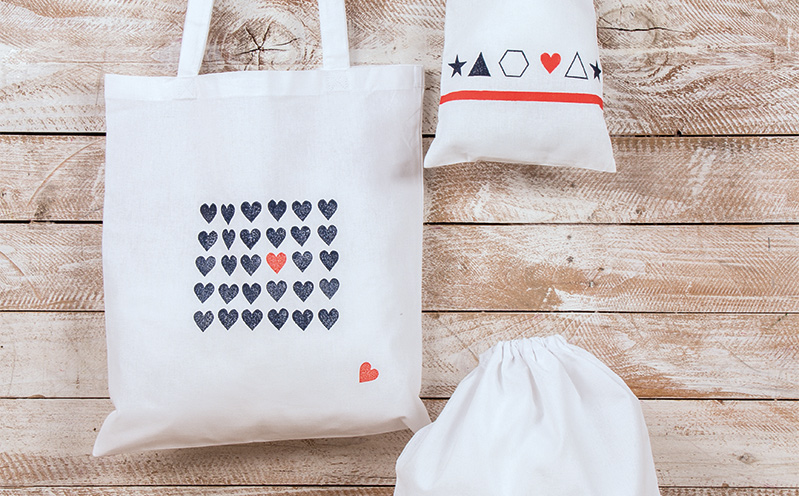 Anleitung in 4 Schritten Die Baumwolltasche mit Herz – aufgestempelt und zum Ausführen bereit.