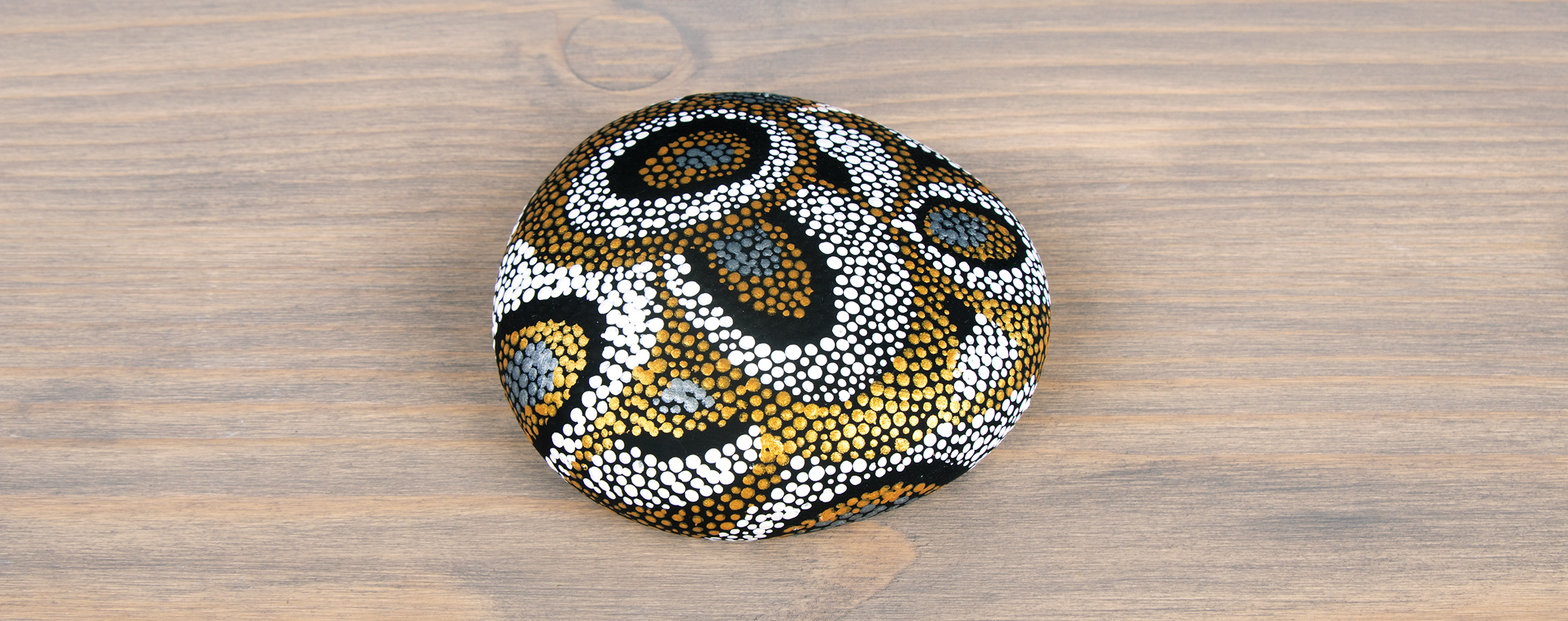 Mit Hilfe des Dot Painting Metallstiftes setzt du mit der Extreme Sheen Farbe silber kleine Punkte auf eine kreisartigen Fläche von ca. 1 cm Durchmesser. Arbeite mit der nächsten Farbe um den entstandenen silbernen Kreis. Wie du deine Kreise gestaltest, bleibt dir überlassen. Es können auch Flächen der Grundierung stehen bleiben. Es ergibt sich ein interessanter Effekt zu den vielen Punkten. Du kannst die Punkte (dots) rund oder oval, groß und klein gestalten. Sei frei und kreativ.