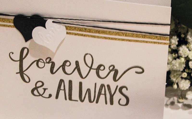 Bestempel die Karte quadratisch weiß metallic mit dem Stempelkissen „Memento“ schwarz und dem Stempel „Forever & Always“.