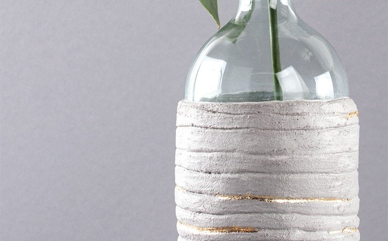 Anleitung in 12 Schritten Knetbeton bringst du auf die Glasflasche auf und hast so eine ganz individuelle Vase. Für das raffinierte Linienmuster einfach mit dem passenden Modellierwerkzeug Rillen einarbeiten.