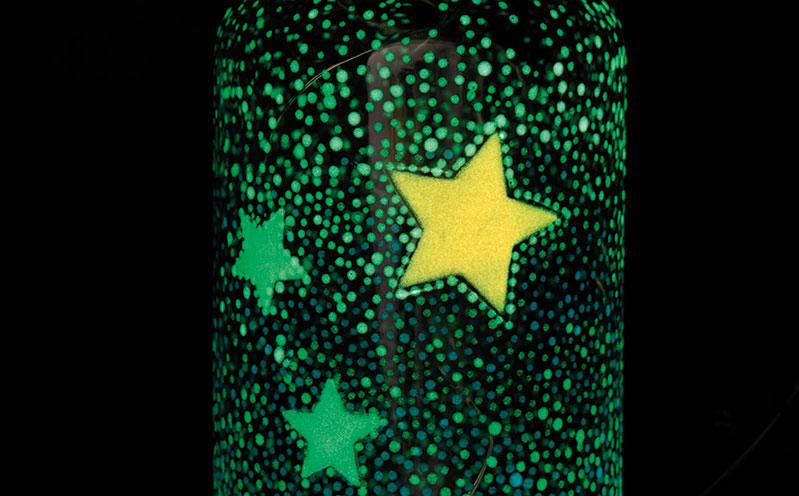 Anleitung in 5 Schritten Im Dunkeln kommt die Deko Glasflasche mit der Lichterkette so richtig zur Geltung. Die Glow in the dark Farbe sorgt für ein Funkeln – auch nachts.