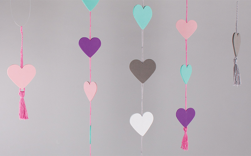 Anleitung in 9 Schritten Herz an Herz. Geknotete Bänder und die Quaste am Ende rahmen die Moosgummi-Herzen wunderschön ein. Und so geht’s: