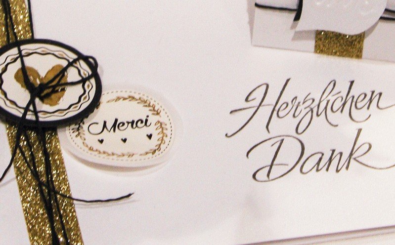 Mit dem Stempelkissen Memento schwarz und dem Stempel "Herzlichen Dank" bestempelst du die Karte.2 ![]()
