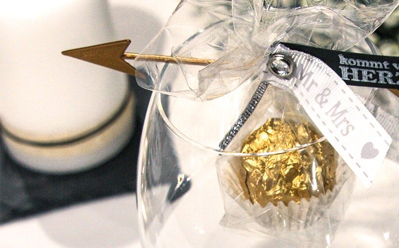 Anleitung in 3 Schritten Am Metallpfeil befestigst du die Süßigkeit deiner Wahl und verzierst ihn mit Tags und Bändern. Und so geht’s: