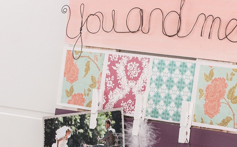 You and me auf ein Papier vorschreiben und mit dem Draht an den Buchstaben entlang biegen. Den Papier-Herz-Anhänger biegst du ebenfalls aus Draht.Eine Schriftvorlage findest du im PDF der Bastelidee. Einfach herunterladen.