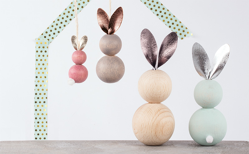 Für die farbigen Hasen wischst du die Rohholzkugeln mit der entsprechenden Farbe. Bei den stehenden Hasen klebst du die zwei Rohholzkugeln mit dem Multi-Kleber zusammen. Bei den hängenden Hasen knotest du die Dekokordel an den zwei Enden zusammen und klebst den Knoten mit dem Multi-Kleber in die größere Rohholzkugel. Anschließend fädelst du die kleinere Rohholzkugel auf die Deko Kordel.3 ![]()