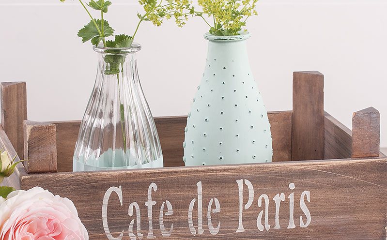 Die Schriftzüge „Cafe de Paris“ und „Fleurs Bistro“ werden mit der Malschablone „French Living“ gestaltet. Dafür schneidest du die Schriftzüge aus und fixierst sie mit Tesa damit sie nicht verrutschen.5 ![]()