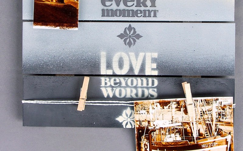 Sprühen Sie mit dem Sprühkleber non-permanent über die Schablone Lebe den Tag und lassen diese etwas ablüften. Platzieren Sie die Schablone mittig auf dem Holz-Lattenrahmen, beginnend mit dem Schablonenmotiv bei ca. 1,5 cm von der oberen Kante des Holzlattenrahmens aus. Kontrollieren Sie, dass die Schablone richtig auf den Holzlatten positioniert ist, damit alle Schriftzüge später gut zu sehen sind. Decken Sie den jeweiligen nicht benötigten Bereich der Schablone beispielsweise mit einem aufgelegten Karton/Papier ab.