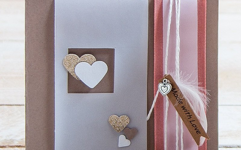 Anleitung in 4 Schritten Verschiedene Bänder und Kordeln befestigst du auf der quadratischen Karte. Die bereits fertigen Fähnchen „Made with love“ befestigst du an deiner Karte. Und so geht’s: