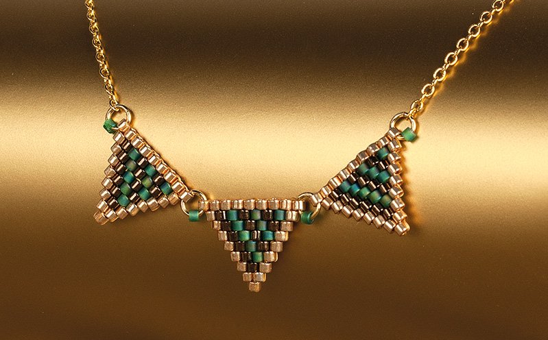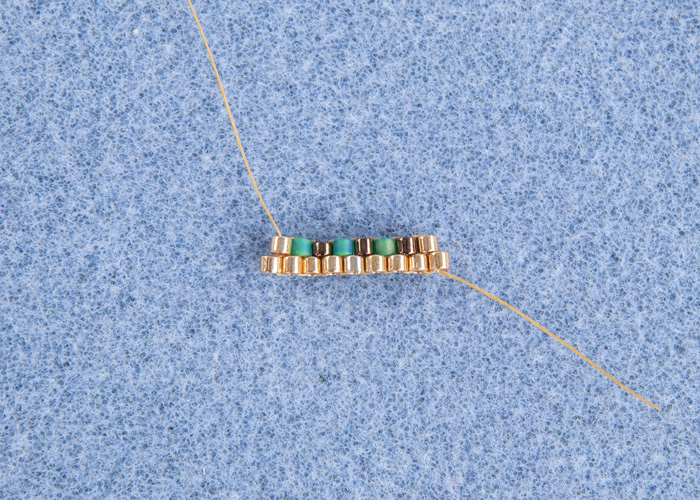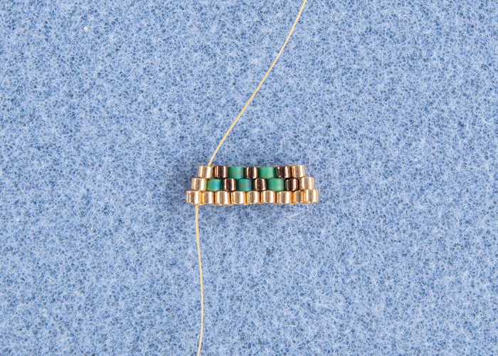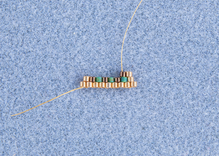 Brickstich: Die erste Rocaille der zweiten Reihe auffädeln und zwischen den Rocailles der ersten Reihe durchfädeln.6 ![]()