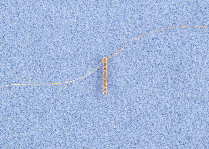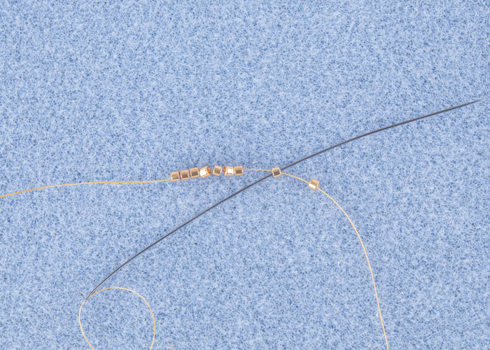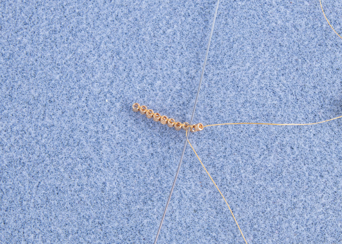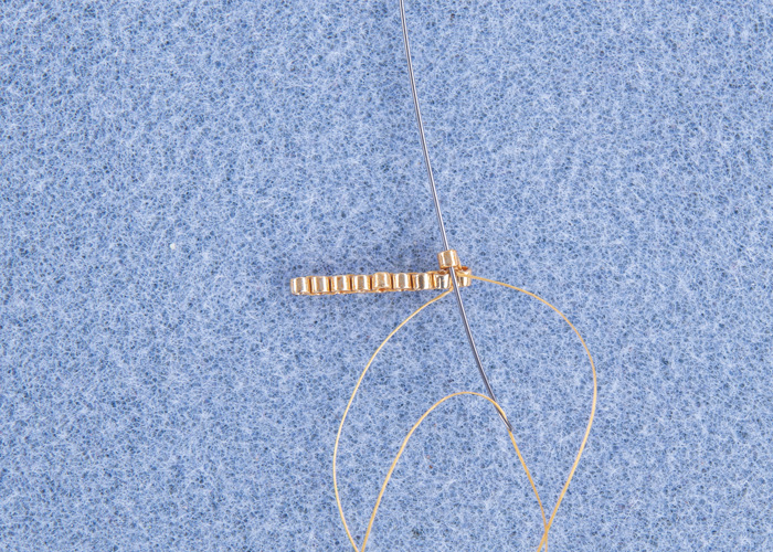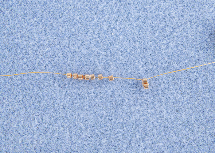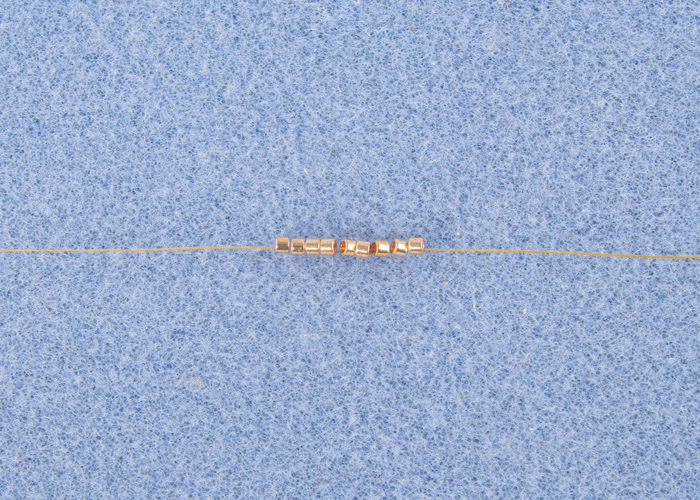 Auf 60 cm Aufreihgarn 9 Delica-Rocailles, gold auffädeln.Bilder zu den Schritten findest du im PDF der Bastelidee. Einfach herunterladen.