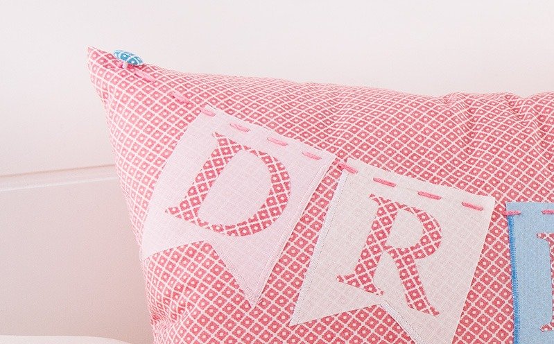 Anleitung in 14 Schritten Die Buchstaben stanzt du aus dem Wimpelstoff aus und applizierst sie auf dem Kissenstoff. Unsere Füllwatte macht das Kissen besonders bauschig. Und so geht’s: