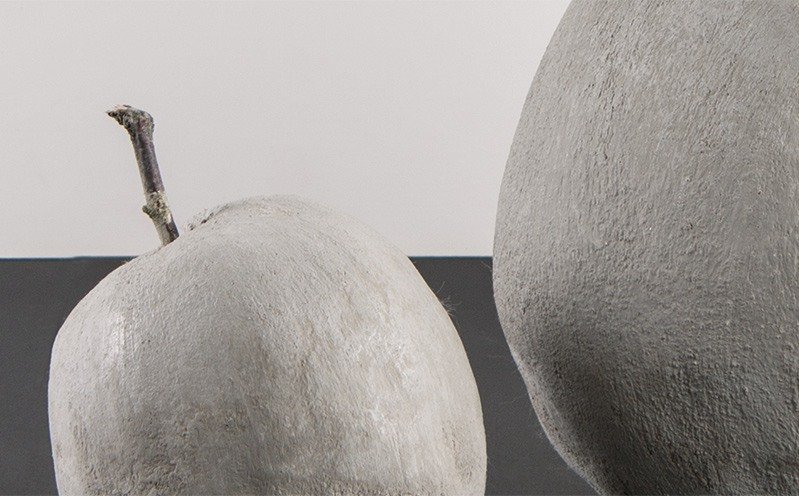 Trage die Betonmasse mit der Hand auf die ummantelte noch feuchte Kugel auf und modelliere diese apfelförmig. Eventuell mit einem leicht befeuchteten Pinsel den Beton nach oben glatt streichen.6 ![]()
