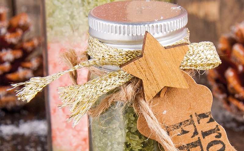 Anleitung in 4 Schritten Grün gefärbtes Badesalz macht sich gut in einem Glasgefäß mit Schraubverschluss. Ein paar Holzstreu-Sterne und Glitterband zum Verzieren und fertig ist der DIY-Badezusatz.