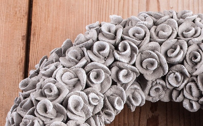 Forme aus dem restlichen angemischten Knetbeton kleine Röschen. Nehme dazu etwas Beton zwischen die Handflächen, drücke diesen flach und rolle ihn zu einer kleinen Mittelblüte ein. Forme anschließend kleine, plastische Blätter und drücke diese versetzt rund um die Mittelblüte an (die Verbindungsstelle evtl. mit dem Daumen verstreichen). Beachte: Besonders schön wird der Kranz mit kleinen Röschen. Je mehr Rosenblätter du rundherum anordnest, desto größer wird die Rose!Tipp: Die Betonmasse sollte geschmeidig und gut formbar sein. Ist der Beton beim Kneten zu rissig, besprühst du diesen mit etwas Wasser. Setze die modellierten Röschen auf den mit Beton ummantelten Kranz-Abschnitt an (die Verbindungsstelle sollte feucht sein) und verstreiche die Verbindungsstelle mit dem Daumen.