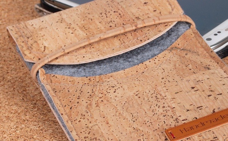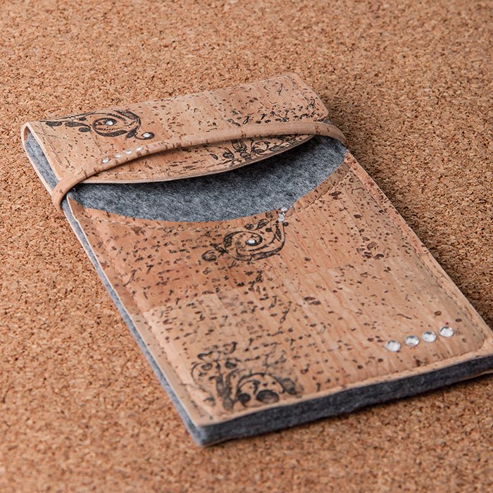 Zum Schluss fixierst du das Korkband so, dass der Umschlag (die Klappe) hineinpasst und nähst es auf der Rückseite der Handytasche mit Hand und ein paar Stichen fest.