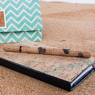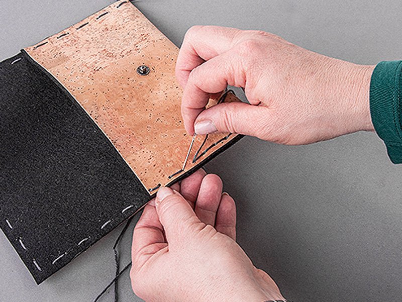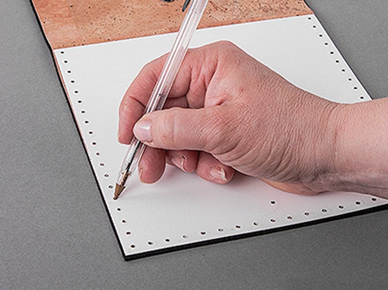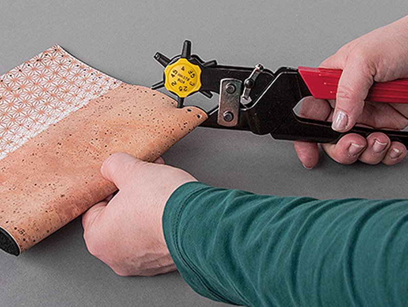 Anleitung in 8 Schritten Für das Muster schablonierst du ein Teil des Korkzuschnitts. Damit die Naht schön gleichmäßig wird, nutz die Schablone, um mit der Lochzange die Löcher zu stechen.