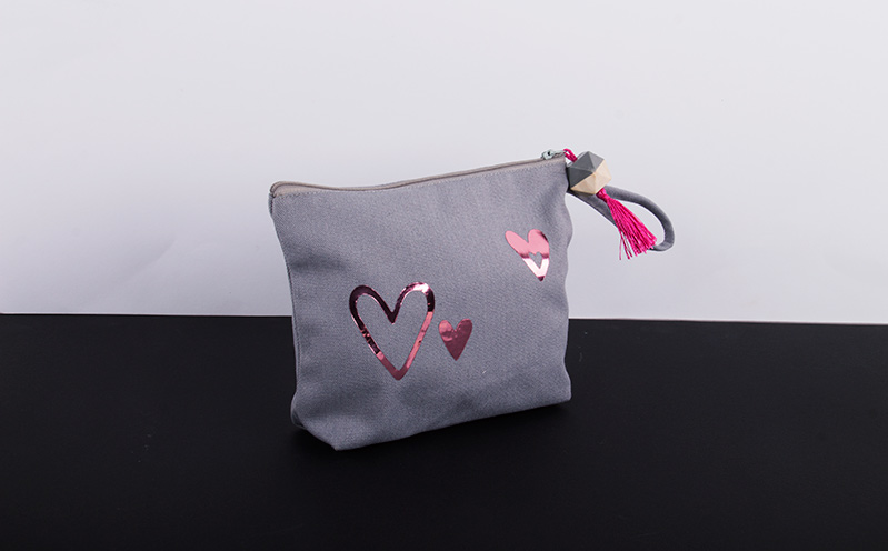 Anleitung in 7 Schritten Aus der rosa glitzernden Folie stanzt du Herzen aus und bügelst sie auf das unifarbene Kosmetiktäschchen.