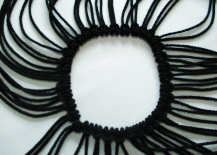1 × 1,70 m und 35 × 1,40 m Kordel (Garn) zuschneiden. Um das Aufspringen der Kordeln zu vermeiden alle Enden einzeln verknoten. Die 1,70 m Kordel zur Hälfte legen und im Durchmesser des Lampenschirms mit einem Überhandknoten verbinden.2 ![]()