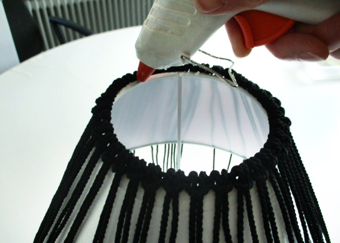 Den gefertigten Ring mit Heißleim auf dem Lampenschirm befestigen.4 ![]()