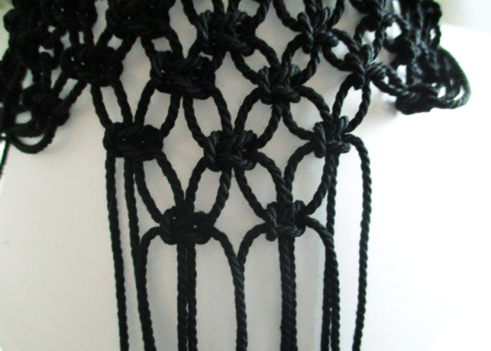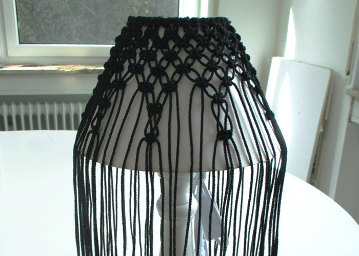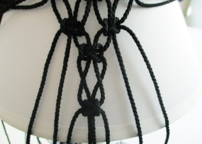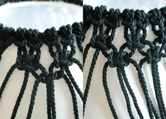 Für die 2. – 4. Reihe jeweils die Hälfte zweier Knoten mit Weberknoten verbinden. Da der Lampenschirm konisch ist, die Abstände zwischen den Reihen jeweils etwas vergrößern.6 ![]()