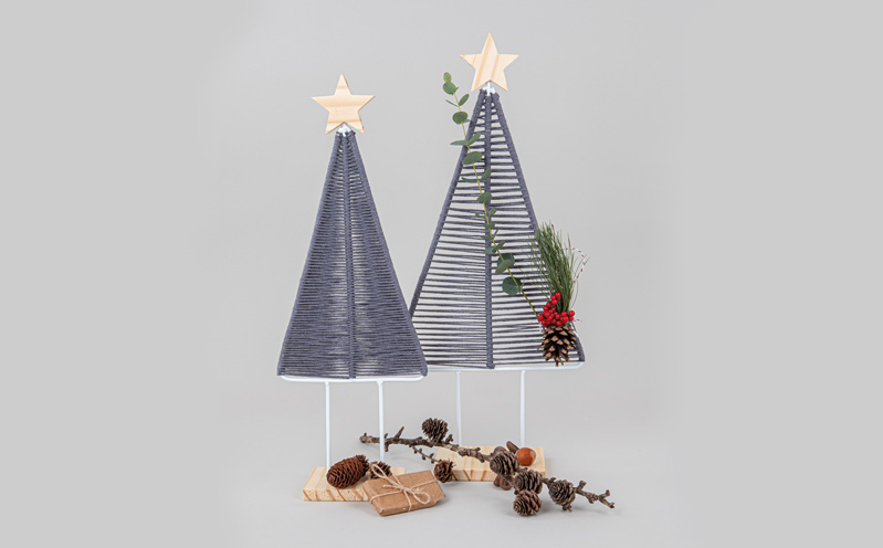 Stecke den Metallbaum in den Holzsockel. Zuerst schneidest du vom Braidy Recycling Garn 2 × 10 m Stücke zu und wickelst sie jeweils zu einem Knäuel auf.