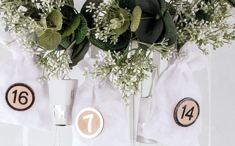 Die Baumwoll-Säckchen befüllst du mit Seidenpapier oder kleinen Geschenken und klebst die MDF-Adventzahlen auf.