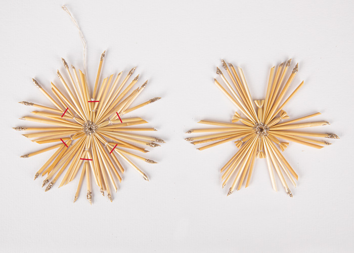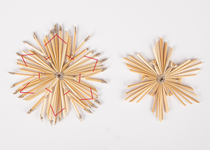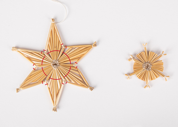 Schneide die Strohsterne laut Vorlage (Steppfotos) mit der spitzen Papierschere zu. Dabei helfen dir die roten Markierungen. Beachte, dass die Schnitte speziell für 2 Modelle der Sterne aus der Box gemacht wurden.