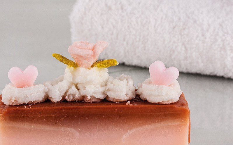 Schneide den Seifenblock in 4-5 Stücke (idealerweise mit einer Japanspachtel erhältlich im Baumarkt). Setze die Sahnekringel (siehe Anleitung Sahnetupfer) mit etwas flüssiger weißer Seife auf die gegossene Seifenschnitte und stecke in die noch feuchte Knetseife die ausgestochenen Herzchen (siehe Anleitung Ausstecher).