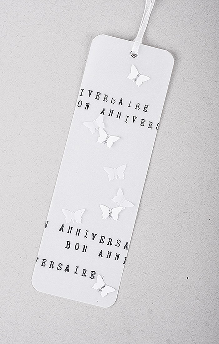 Bestempele den Anhänger mit Hilfe des Wortbandstempels und des Stempelkissens „StazOn“. Stanze aus Pergamentpapier und weißem Papier mit dem Motivstanzer Schmetterlinge und klebe diese mit Quickie Glue auf den Anhänger. Die Schmetterlingskörper mit Quickie Glue anzeichnen und Flitter einstreuen. Abschließend das Organzaband als Aufhängung einfädeln.3 ![]()