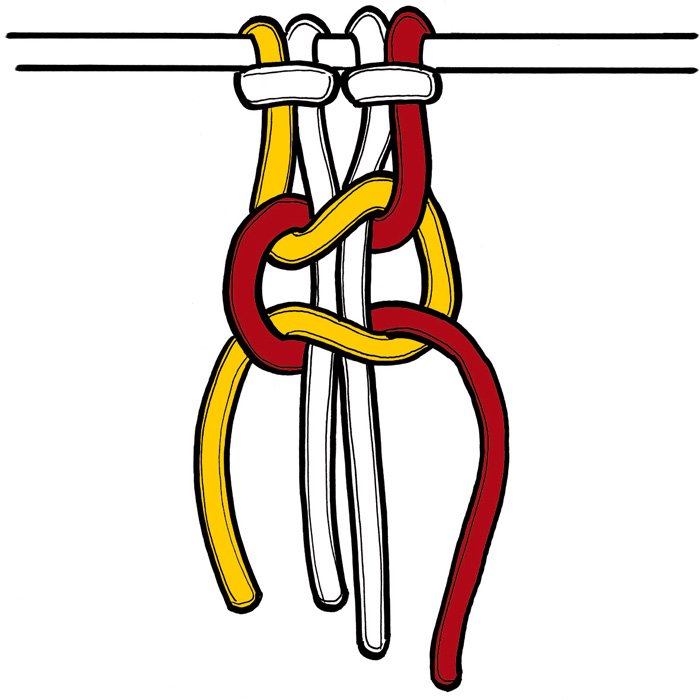 Wie folgt ausrichten: Die beiden langen Fäden rechts und links legen, die drei 30 cm langen Fäden unter den Strang mit den Großloch Rocailles legen. Knüpfe mit den beiden langen Fäden einen Weberknoten.
