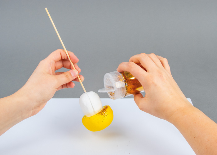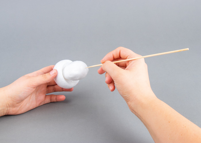 Stecke alle 5 Styropor-Pilze auf einen Holzspieß.
