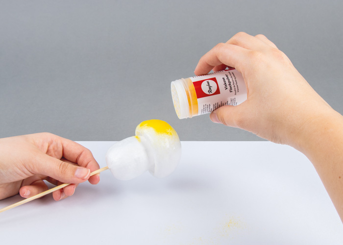 Bestreiche den Pilzhut gleichmäßig und satt mit Flitterkleber und dem Flachpinsel. Streue das Viskose Flockpulver in der gewünschten Farbe zügig und gleichmäßig auf den feuchten Kleber. Gut abschütteln und etwas antrocknen lassen.