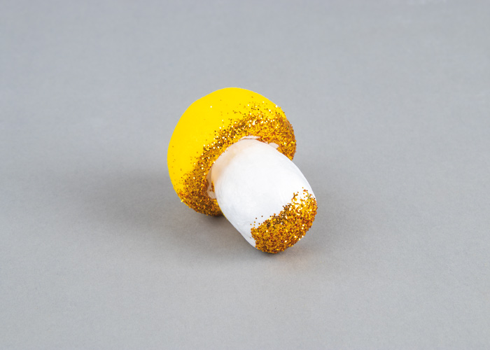 Streiche mit dem Rundpinsel die untere Seite und den Rand des Pilzhutes mit dem Flitterkleber ein und streue den farblich passenden Streuflitter in den Kleber. Ebenfalls streichst du unten am Pilzstiel noch etwas Flitterkleber auf und streust den Streuflitter ein, so dass es wie eine Pilzwurzel aussieht.