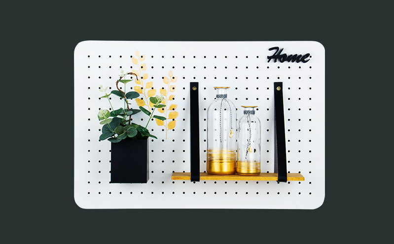 Schraube dann das Metall Utensilo am Pin & Peg Board an.