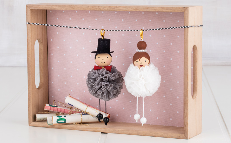 Anschließend weiße Holzperlen der Mischung als Schuhe auffädeln und als Abschluss einen Knoten an der gewünschten Beinlänge setzen. Die Kordelenden abschneiden.7 ![]()