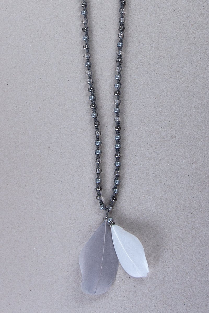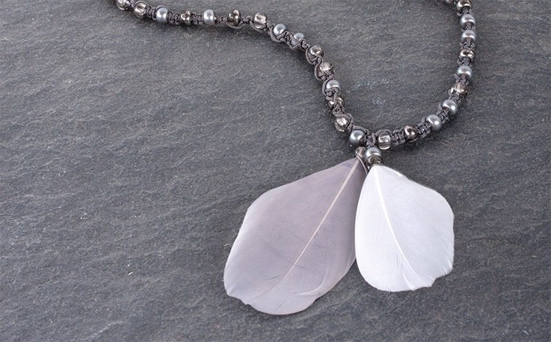Anleitung in 6 Schritten Die grauen Rocailles Perlen knüpfst du nach Anleitung ein und bekommst so die filigrane Kette gut hin. Die Federn werden zum besonderen Hingucker. Und so geht’s: