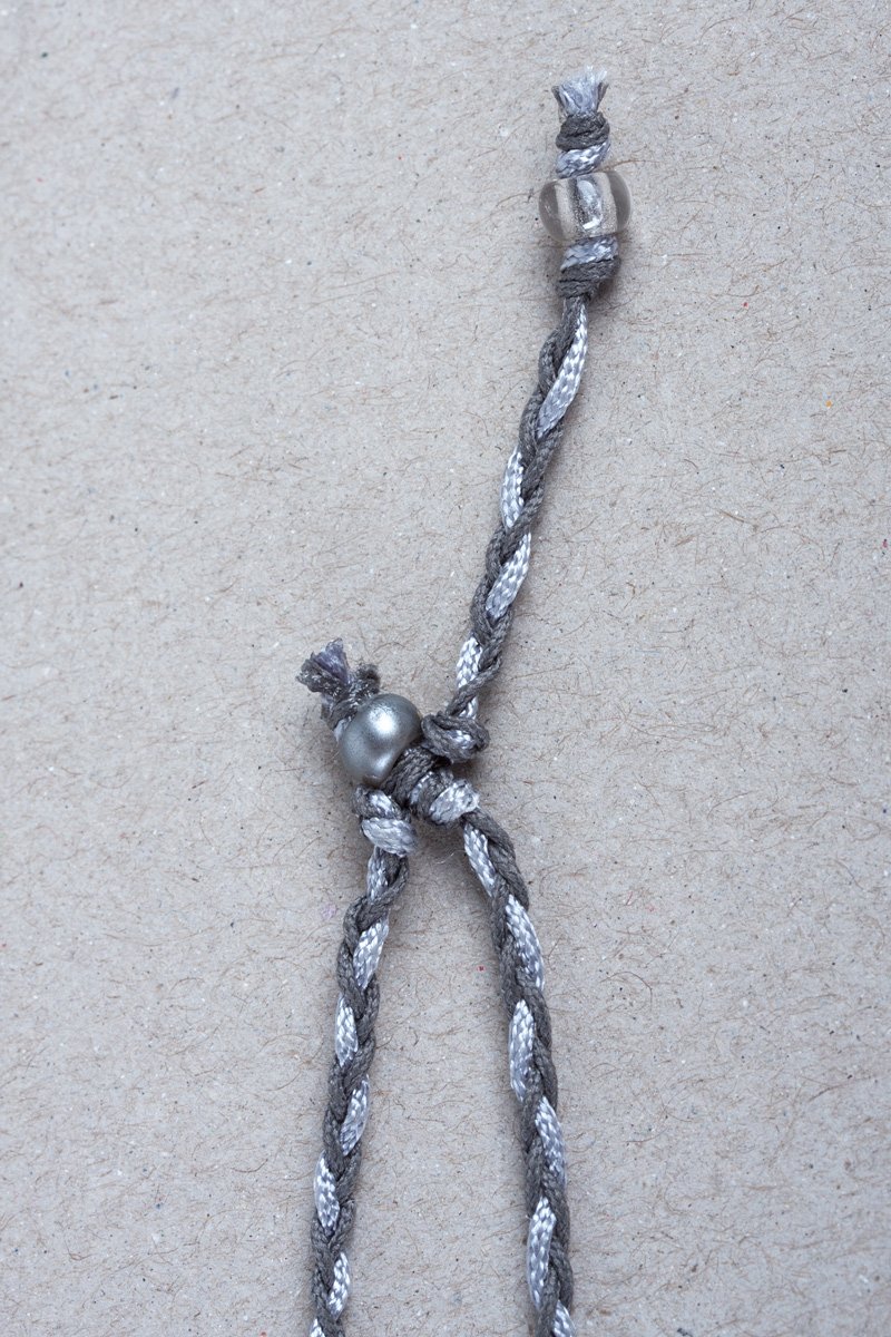 Die Enden wie folgt erstellen: Die Kordeln einer Seite zu einem 9 cm langen Zopf flechten, am Ende eine Rocaille anknoten. Die zweite Seite gegengleich flechten, einen Überhandknoten setzen das Ende der anderen Seite zwischen die Kordeln legen und mit einem weiteren Überhandknoten fixieren. Den Zopf 2,5 cm lang weiterknoten und am Ende eine Rocaille anknoten.