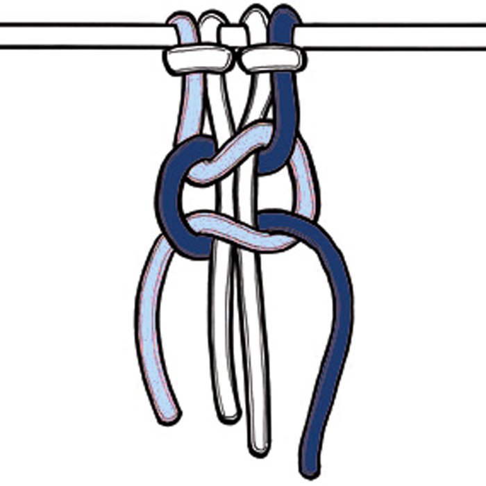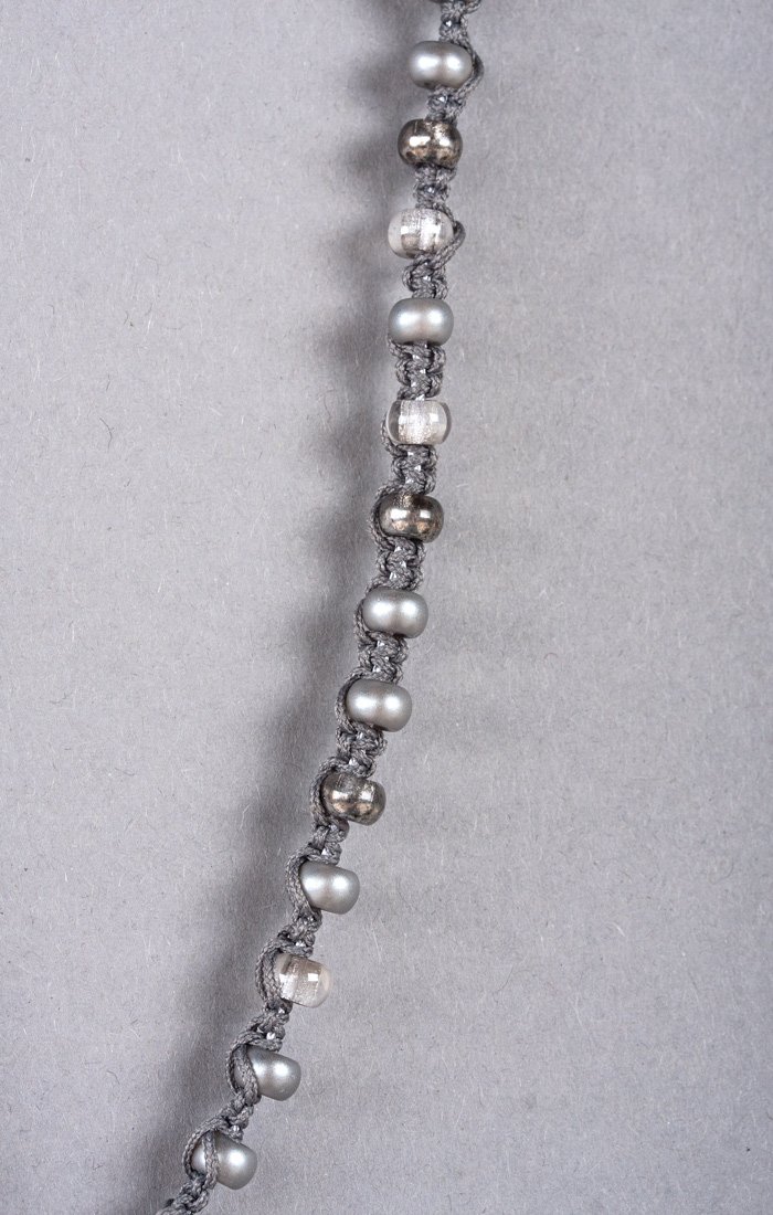 Nun eine Rocaille hochschieben, die beiden langen Kordeln über der Rocaille kreuzen, danach zwei weitere Weberknoten knüpfen. Fortlaufend wiederholen bis alle Rocailles eingeknüpft sind.