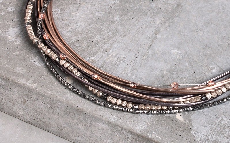 Anleitung in 8 Schritten Rosé- und anthrazitfarbene Kunstlederbänder, kombiniert mit rosé- und kupferfarbenen Perlenbändern, ergeben dieses schimmernde Armband. Und so geht’s:
