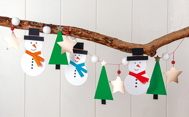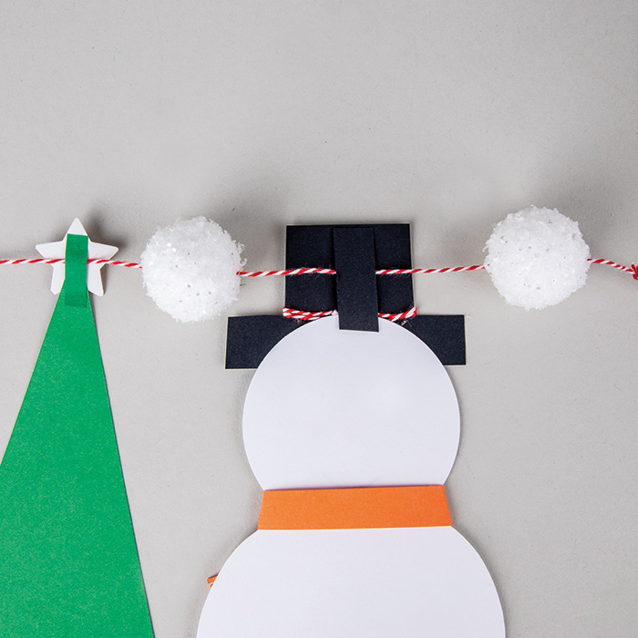 Tipp: Wenn du beim Hut des Schneemanns und beim Baum an der Spitze rückseitig einen kleinen Steg aus einem Streifen Papier klebst, hängen Schneemann und Baum an der Girlande schöner.
