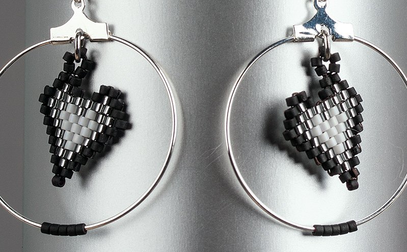 Anleitung in 16 Schritten Die schwarzweißen Miyuki Herzen sind besonders filigran gearbeitet und passen perfekt in die Ohrkreole. Und so geht’s: